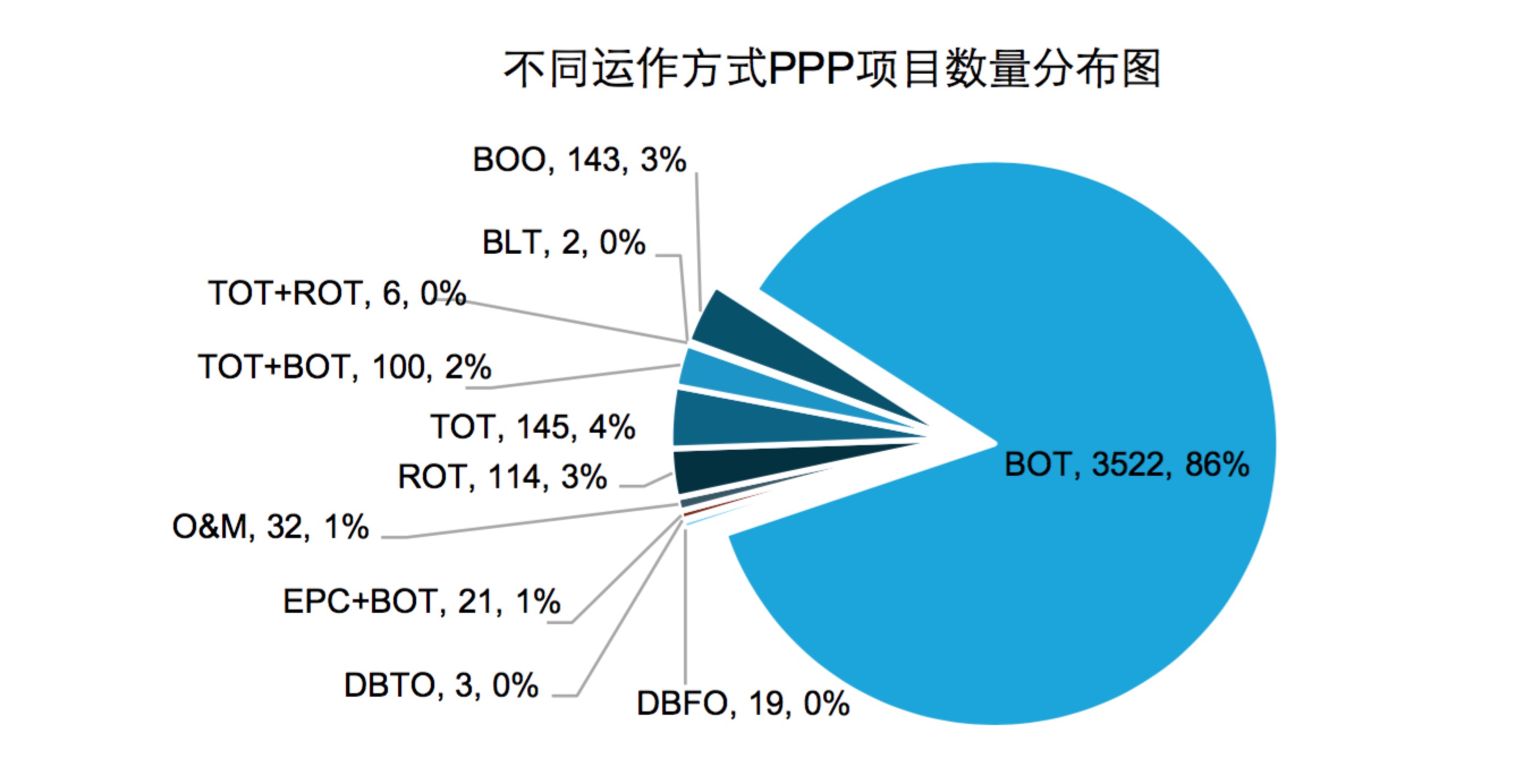 民營企業(yè)即將迎來存量項目市場空間釋放的發(fā)展契機。根據(jù)明樹數(shù)據(jù)統(tǒng)計,在具有明確PPP運作方式的已成交項目中,采用BOT運作方式的PPP項目仍然占主導地位,數(shù)量占比高達86%;TOT和ROT類項目合計僅占9%左右。