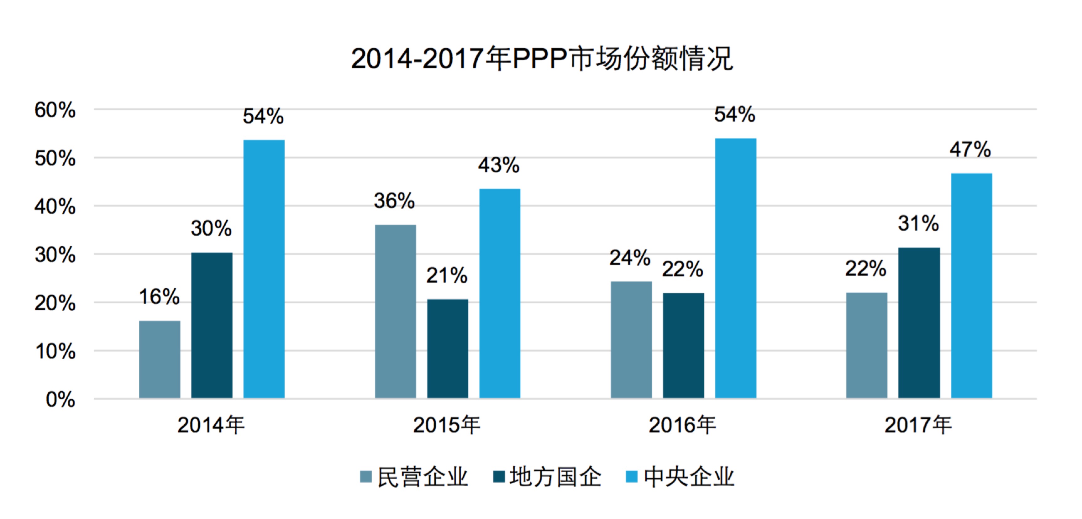 在具有中國特色的PPP市場,“社會資本”取代了傳統(tǒng)意義上“私營資本(Private)”成為了第二個“P”。2015年以來,中央企業(yè)和地方國企逐漸成為我國PPP市場的主力軍,而民營企業(yè)表現(xiàn)欠佳。根據(jù)明樹數(shù)據(jù)統(tǒng)計,民營企業(yè)PPP市場份額呈現(xiàn)出持續(xù)下降的趨勢,成交(具有中標信息且牽頭人為民營企業(yè)的項目)規(guī)模占比從36%下降到22%(截至2017年11月底)。