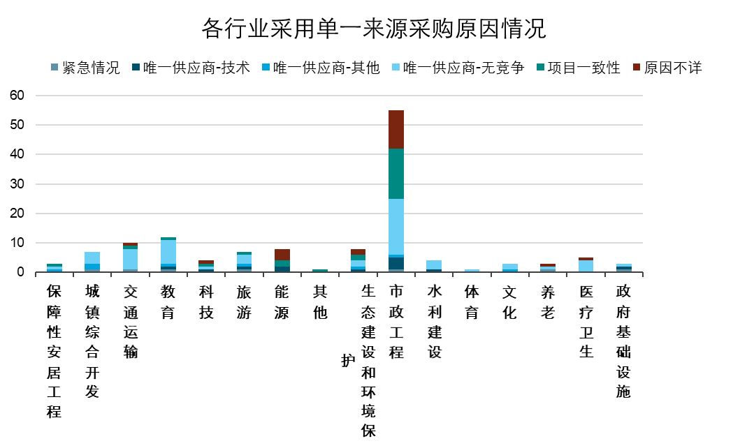 從各行業(yè)的具體項(xiàng)目來(lái)看,沒(méi)有哪個(gè)行業(yè)由于技術(shù)原因而大量使用單一來(lái)源采購(gòu)模式,其中其他類的兩個(gè)項(xiàng)目分別來(lái)自不同行業(yè),一個(gè)是教育類其他,一個(gè)是政府基礎(chǔ)設(shè)施建設(shè)其他,大部分的項(xiàng)目均是市政工程類,也有能源、科技、環(huán)境保護(hù)等行業(yè)的項(xiàng)目由于技術(shù)原因采用了單一來(lái)源采購(gòu)模式選取供應(yīng)商。