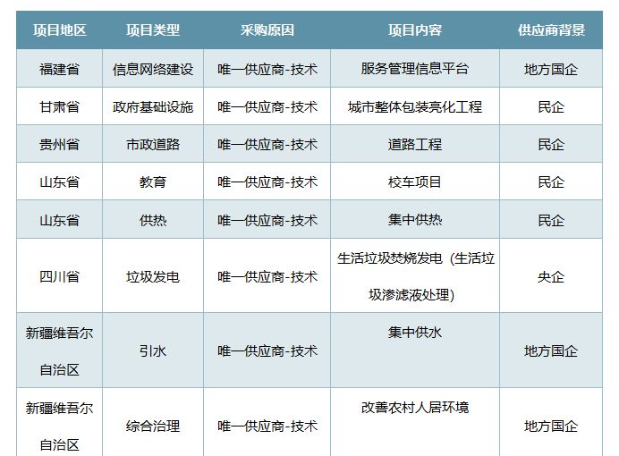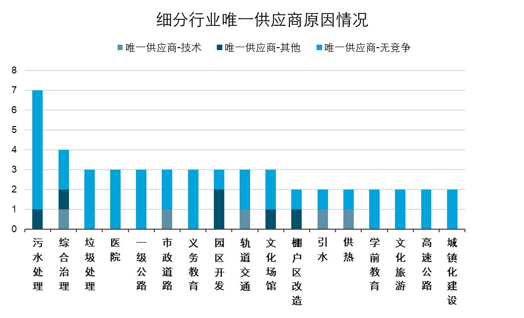 由于專利技術(shù)、參與投標(biāo)企業(yè)少或地域限制等原因僅能從唯一供應(yīng)商處采購(gòu)的情況中,污水處理行業(yè)使用單一來(lái)源采購(gòu)模式的情況較多,共有7個(gè)項(xiàng)目,其中大部分是由于參與投標(biāo)的企業(yè)太少導(dǎo)致兩次流標(biāo)后改變了采購(gòu)方式,雖然參與該項(xiàng)目企業(yè)少的原因不好斷定,但也可以從側(cè)面反映出這些行業(yè)的項(xiàng)目缺乏一定的競(jìng)爭(zhēng)性,或是由于技術(shù)門檻導(dǎo)致,或是由于回報(bào)較低導(dǎo)致,暫不能確定。