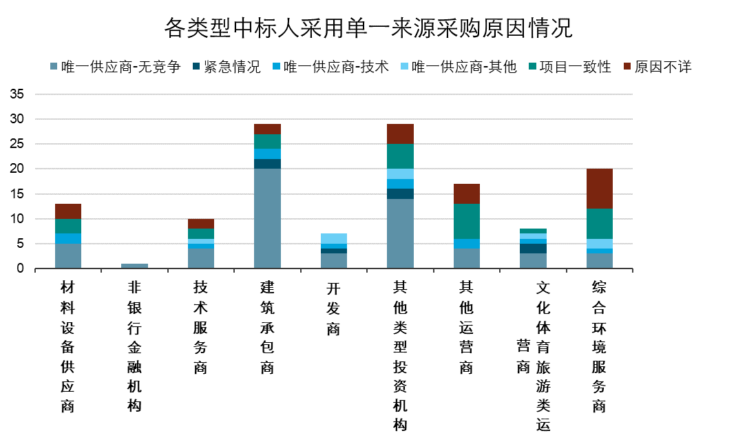 從各個(gè)行業(yè)落地的PPP項(xiàng)目來(lái)看,采用單一來(lái)源采購(gòu)的情況主要集中在市政工程行業(yè)、教育行業(yè)和交通運(yùn)輸行業(yè),其中市政工程共有55個(gè)項(xiàng)目采用了單一來(lái)源采購(gòu)的方式選取供應(yīng)商,具體原因如圖8所示,除原因不詳?shù)捻?xiàng)目外,市政工程類項(xiàng)目中主動(dòng)選擇單一來(lái)源采購(gòu)模式的項(xiàng)目占比較多,其中主要原因是為了保持項(xiàng)目一致性,但無(wú)論是主動(dòng)選擇還是被動(dòng)選擇,唯一供應(yīng)商都是各類型項(xiàng)目選擇單一來(lái)源采購(gòu)的最主要原因。