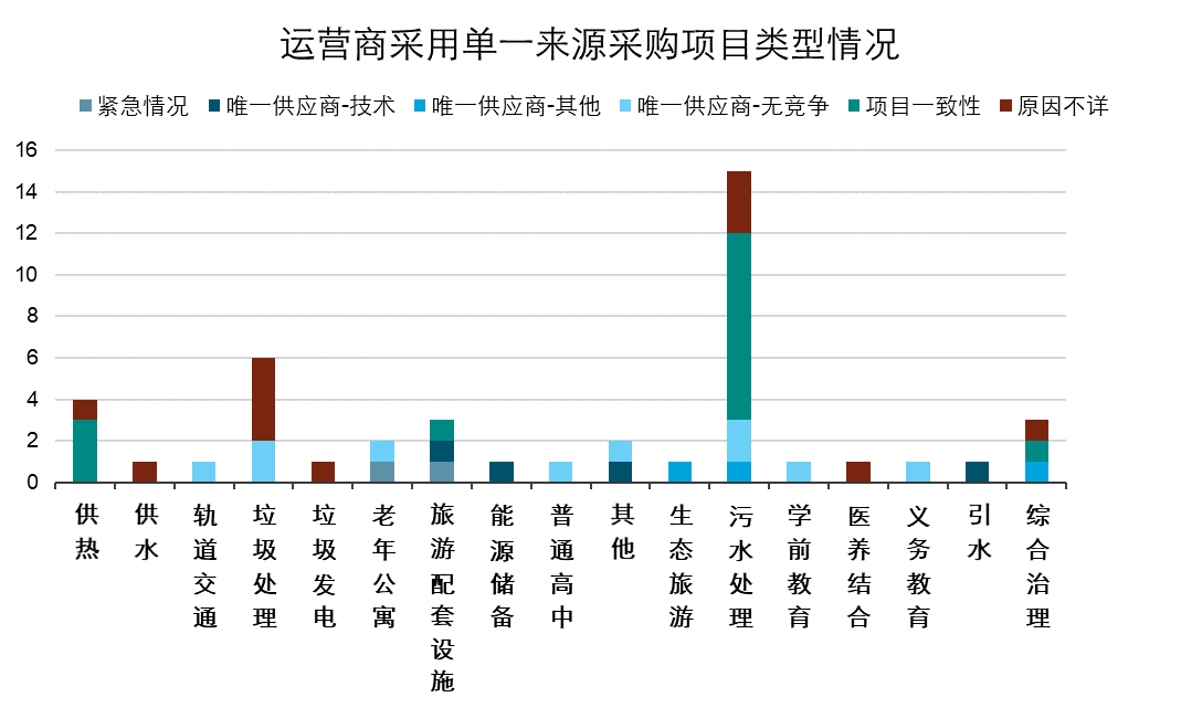 從各類型中標(biāo)人采用單一來(lái)源采購(gòu)模式的情況來(lái)看,大多數(shù)類型的企業(yè)均是由于參與投標(biāo)的企業(yè)太少缺乏競(jìng)爭(zhēng)而被動(dòng)采用了單一來(lái)源采購(gòu)模式,而其他運(yùn)營(yíng)商和綜合環(huán)境服務(wù)商類型的中標(biāo)人則大多是為了保持項(xiàng)目的一致性而主動(dòng)采用了單一來(lái)源采購(gòu)來(lái)選取供應(yīng)商,從圖11運(yùn)營(yíng)商采用單一來(lái)源采購(gòu)項(xiàng)目類型情況來(lái)看,污水處理類是運(yùn)營(yíng)商中標(biāo)項(xiàng)目中采用單一來(lái)源采購(gòu)模式最多的項(xiàng)目類型,共有15個(gè)項(xiàng)目,其中有9個(gè)均是為了保持項(xiàng)目一致性采用了單一來(lái)源采購(gòu)模式,垃圾處理類和供熱類的項(xiàng)目采用單一來(lái)源采購(gòu)模式也較多。