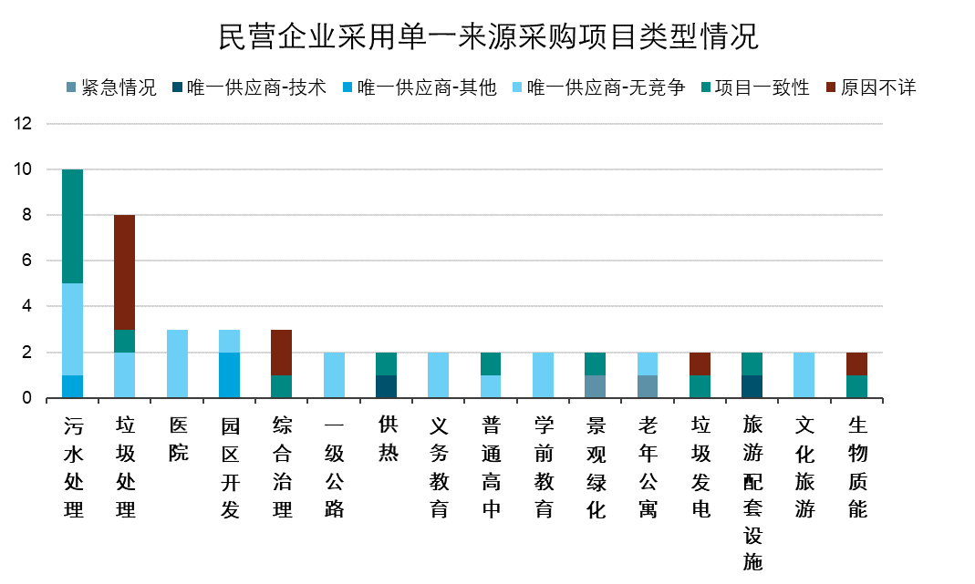 將中標(biāo)人按不同背景分類后可以看出,所有采用單一來(lái)源采購(gòu)的項(xiàng)目中民營(yíng)企業(yè)參與的項(xiàng)目個(gè)數(shù)最多,共有71個(gè),其中有34個(gè)項(xiàng)目是由于參與人太少而轉(zhuǎn)成單一來(lái)源采購(gòu),16個(gè)項(xiàng)目是為了保持項(xiàng)目的一致性。而在民營(yíng)企業(yè)以單一來(lái)源采購(gòu)中標(biāo)的項(xiàng)目中,污水處理和垃圾處理類型的項(xiàng)目最多,分別有10個(gè)和8個(gè),其中污水處理有50%的項(xiàng)目是由于項(xiàng)目一致性而使用了單一來(lái)源采購(gòu)的模式,40%的項(xiàng)目是由于參與投標(biāo)的企業(yè)太少而被動(dòng)采用單一來(lái)源采購(gòu)模式。