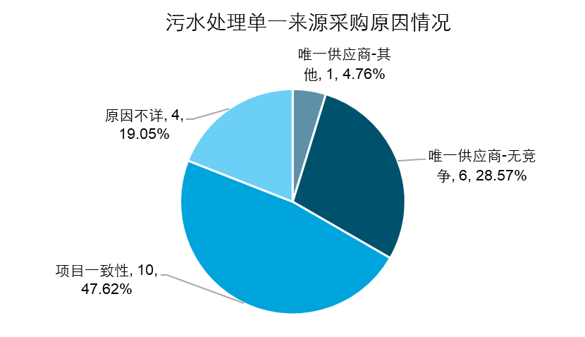 從圖中可以看出,污水處理行業(yè)的項(xiàng)目選擇采用單一來(lái)源采購(gòu)的最主要原因是為了保持項(xiàng)目一致性,從具體的項(xiàng)目可以看出,這部分的項(xiàng)目均是在原有的項(xiàng)目上對(duì)其進(jìn)行提標(biāo)改造,由于供應(yīng)商已經(jīng)與政府合作了一期項(xiàng)目,為了保持項(xiàng)目在技術(shù)、設(shè)備等方面的一致性,通常政府會(huì)主動(dòng)選擇單一來(lái)源采購(gòu)模式與供應(yīng)商續(xù)簽合約,使得項(xiàng)目能更快地開展起來(lái),也在一定程度上降低了項(xiàng)目的前期成本;其次是由于缺乏競(jìng)爭(zhēng)使得僅有唯一供應(yīng)商可選擇,這部分的項(xiàng)目均經(jīng)過(guò)多次招標(biāo),但由于參與的企業(yè)太少而流標(biāo)后改變了采購(gòu)模式,被動(dòng)選擇單一來(lái)源采購(gòu)。