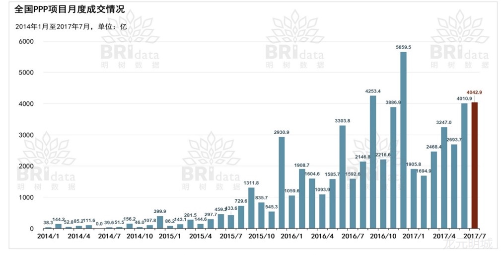本月全國(guó)共成交了4042.90億元的PPP項(xiàng)目,從2014年1月份起至今,全國(guó)范圍內(nèi)公布中標(biāo)的PPP項(xiàng)目已達(dá)到5.98萬(wàn)億元,2017年新成交的項(xiàng)目已經(jīng)達(dá)到2萬(wàn)億元,PPP市場(chǎng)仍然呈現(xiàn)出較快的增長(zhǎng)速度。具體如下圖所示: