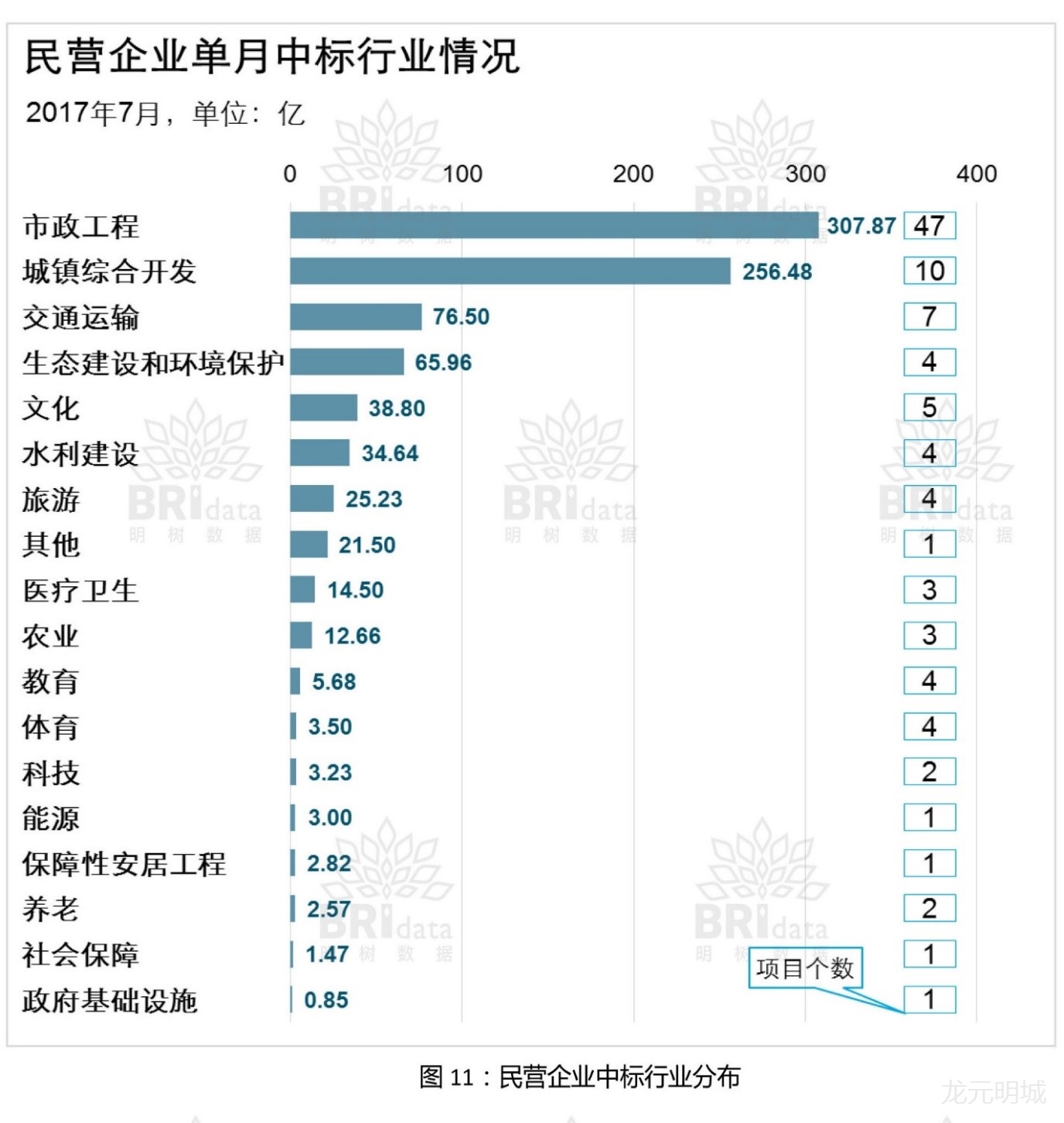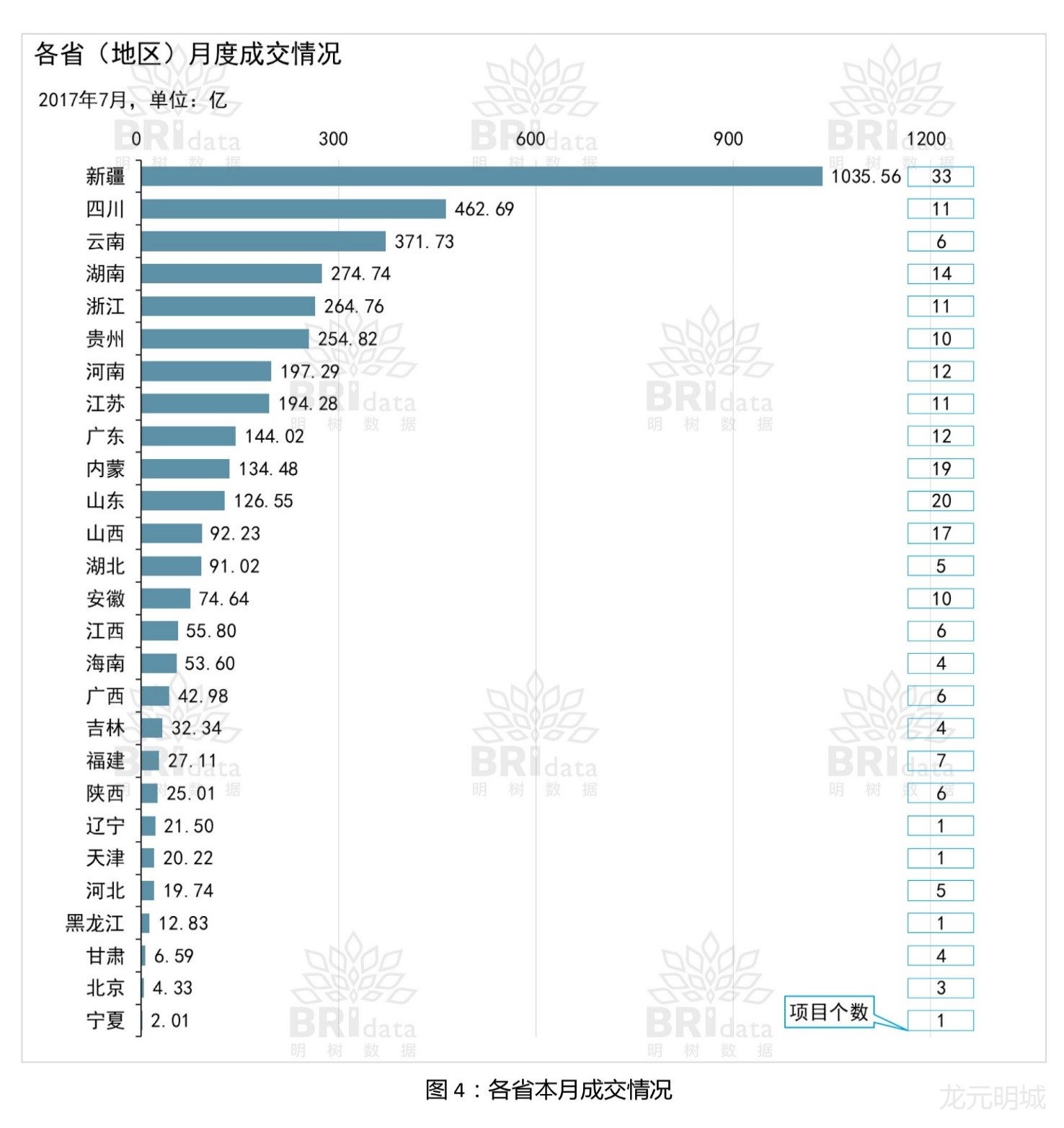 2017年7月,全國(guó)共成交了 4042.9 億元的 PPP 項(xiàng)目。自2014 年 1 月起,截至2017年7月31日,全國(guó)范圍內(nèi)公布成交的 PPP 項(xiàng)目已達(dá)到 5.98 萬(wàn)億元,2017 年新成交的項(xiàng)目達(dá) 2 萬(wàn)億元。7月,新疆、四川、云南成交的項(xiàng)目金額排名前列,分別為 1035.56 億元、462.69 億元、371.73 億元。7月,中標(biāo)規(guī)模最大的項(xiàng)目為云南省墨江至臨滄公路 PPP 項(xiàng)目,項(xiàng)目規(guī)模達(dá)到了 313.04 億元,中國(guó)鐵建股份有限公司力壓群雄勝出。7月,民營(yíng)企業(yè)作為單獨(dú)投標(biāo)方或聯(lián)合體牽頭方共中標(biāo) 104 個(gè)項(xiàng)目,合計(jì) 877.29 億元。