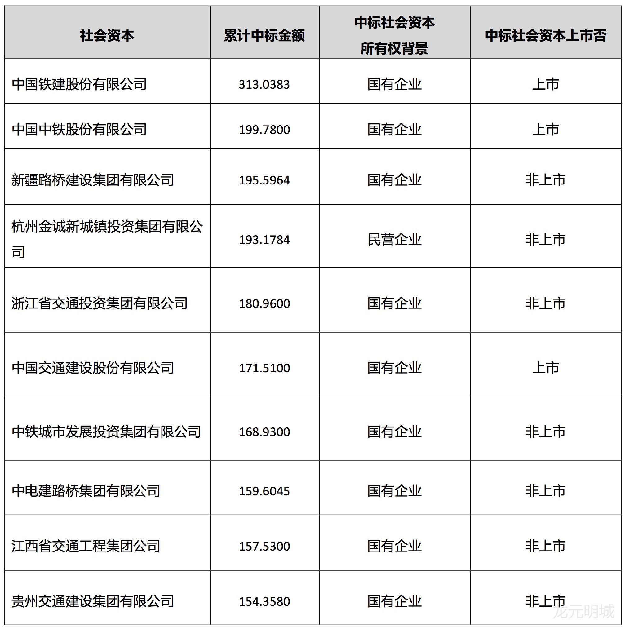 本月中國(guó)鐵建股份有限公司以累計(jì)313.04億元的中標(biāo)金額在市場(chǎng)力壓群雄。排名前10的社會(huì)資本分別為(以下僅統(tǒng)計(jì)社會(huì)資本作為牽頭人或者單獨(dú)中標(biāo)的業(yè)績(jī)):