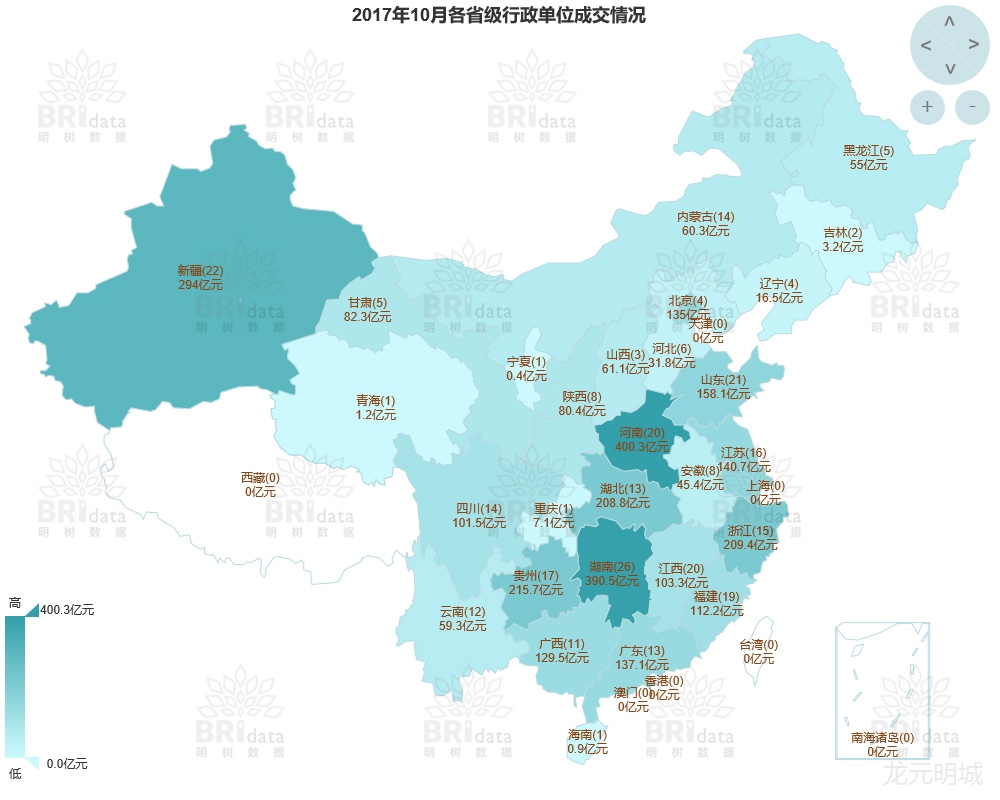 從區(qū)域成交的情況來看,本月河南、湖南和新疆成交的項目金額排名前列,分別成交了400.3億元、390.5億元、294.0億元。截止至2017年10月底,云南省、新疆自治區(qū)和四川省占據(jù)了累計實施PPP項目金額的前三位。具體如下圖所示: