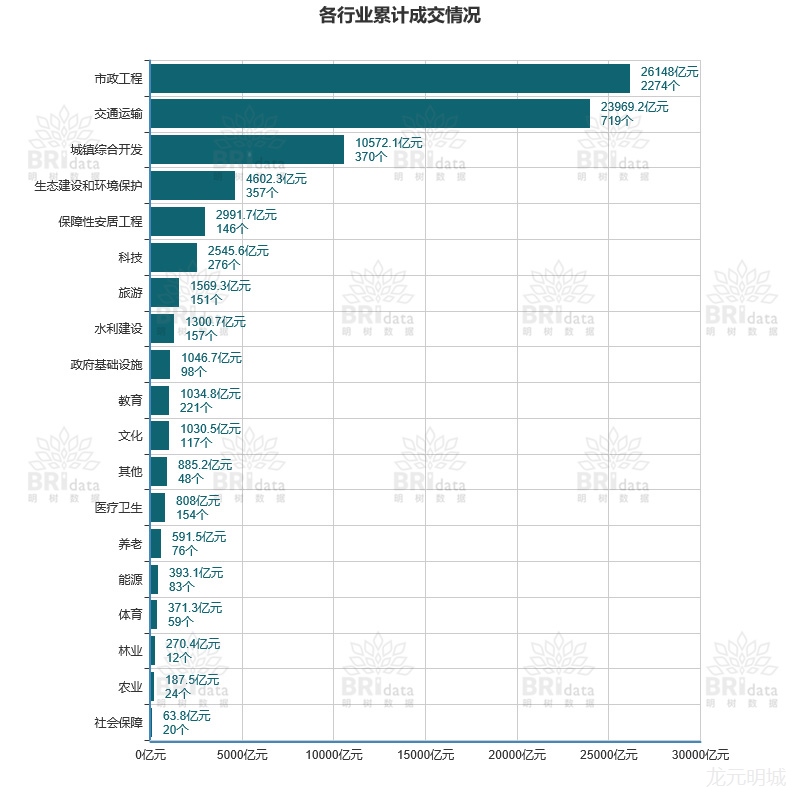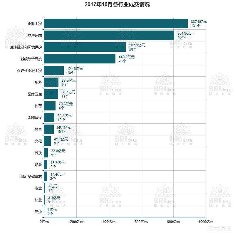 本月市政工程行業(yè)以887.6億元的成交金額占據(jù)了行業(yè)成交榜的首位,交通運(yùn)輸、生態(tài)建設(shè)和環(huán)境保護(hù)等行業(yè)也貢獻(xiàn)了較大的成交份額。具體如下圖所示: