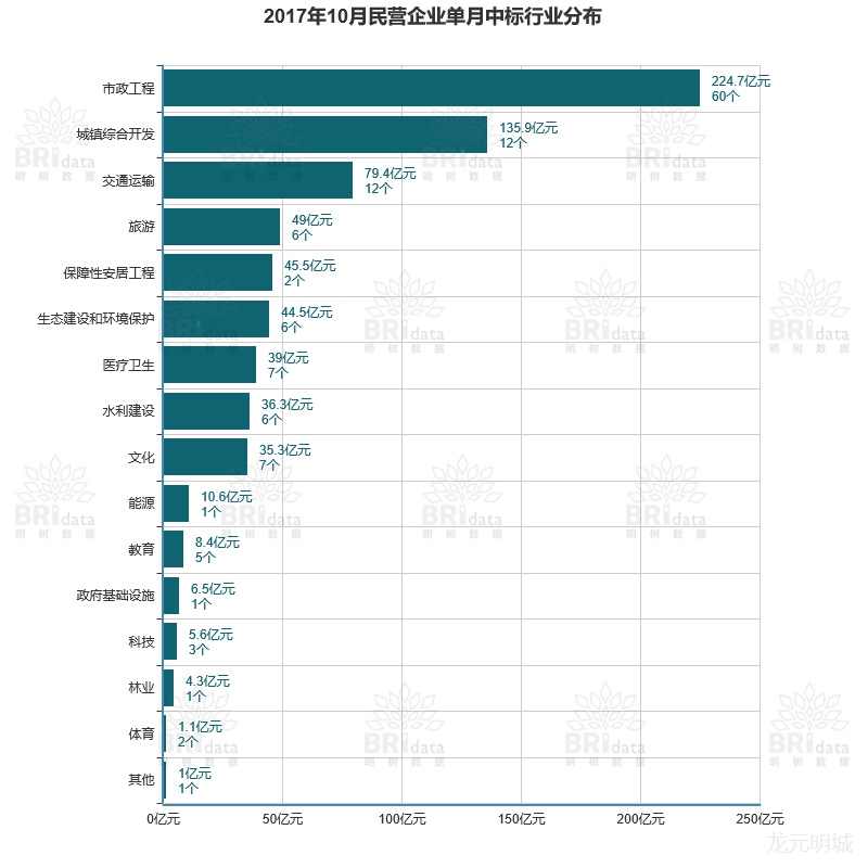 本月民營企業(yè)作為單獨(dú)投標(biāo)方或聯(lián)合體牽頭方共中標(biāo)132個項目,合計726.97億元。中標(biāo)區(qū)域、行業(yè)分布如下圖所示: