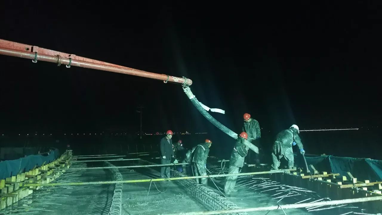 為確保本次澆筑任務(wù)順利完成,該工程投入三個(gè)班組數(shù)十名工人采用兩班倒的方式聯(lián)合施工。經(jīng)過10多個(gè)小時(shí)連續(xù)奮戰(zhàn),于1月7日順利完成既定澆筑任務(wù)。
