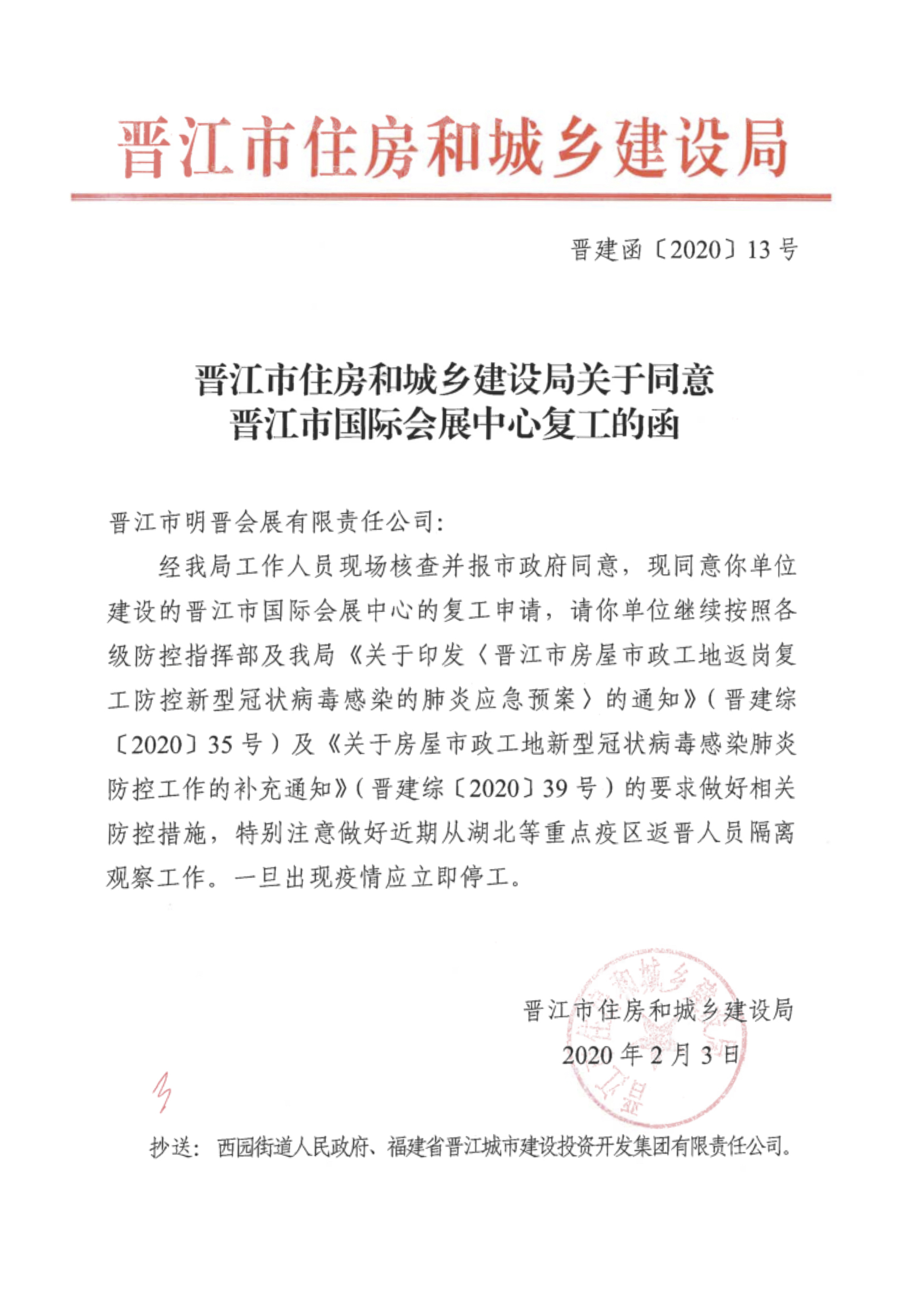 2020年2月10日上午,福建省泉州市委常委、晉江市委書記劉文儒帶隊(duì)調(diào)研復(fù)工的晉江市國(guó)際會(huì)展中心PPP項(xiàng)目,察看疫情防控工作開展情況以及項(xiàng)目復(fù)工情況。