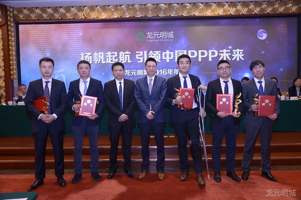 在頒獎環(huán)節(jié)中,公司董事長賴朝暉為項目總監(jiān)和副總監(jiān)頒發(fā)了聘書和龍元明城獨家定制的獎杯,鼓勵其在新的一年做出新的貢獻。主席臺人員為獲得“2016年度優(yōu)秀員工”的5位員工頒獎并授予榮譽證書。